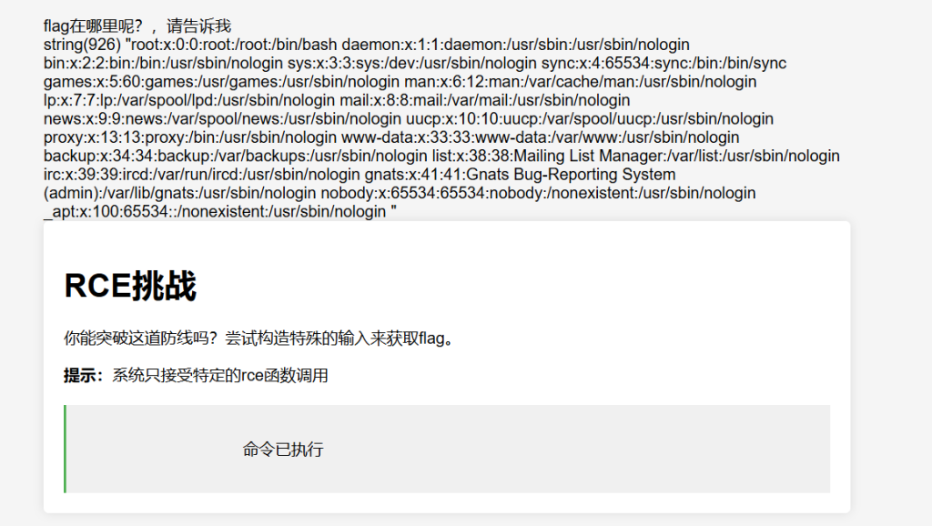 提示要传入特定rce函数 然后名字又叫无参 试了一堆函数 有各种各样的回显